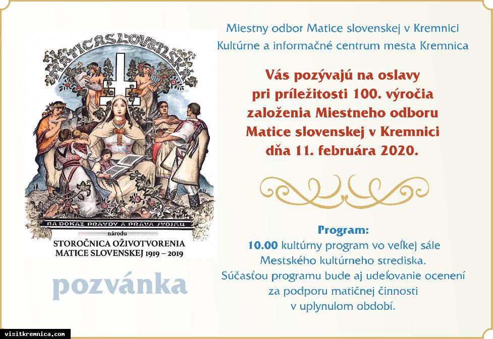 Miestny odbor Matice slovenskej v Kremnici a Kultúrne a informačné centrum mesta Kremnica Vás pozývajú ma oslavy 100. výročia založenia Miestneho odboru MS v Kremnici.