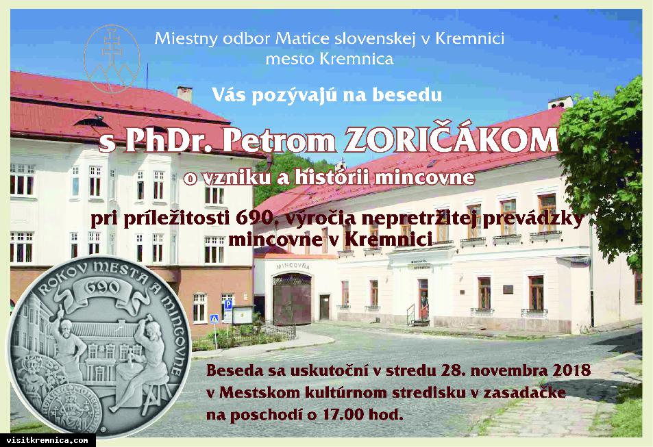 Miestny odbor matice slovenskej v Kremnici a mesto Kremnica Vás pozýva na besedu o vzniku a histórií mincovne, ktorá sa koná pri príležitosti 690. výročia nepretržitej prevádzky mincovne v Kremnici.
