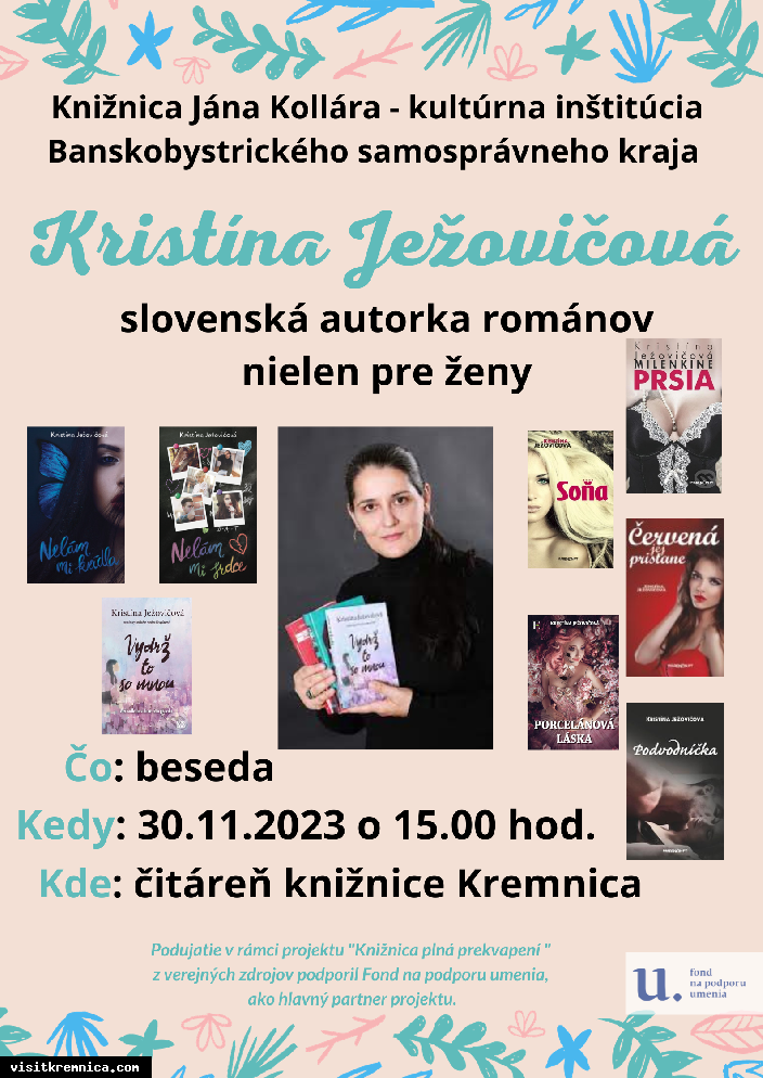 Spisovateľka Kristína Ježovičová je známa hlavne ako autorka románov pre ženy, ale venuje sa aj tvorbe iných románov. Akých? To Vám prezradí na besede, kde predstaví aj svoje nové knižky a porozpráva nielen o svojej tvorbe.