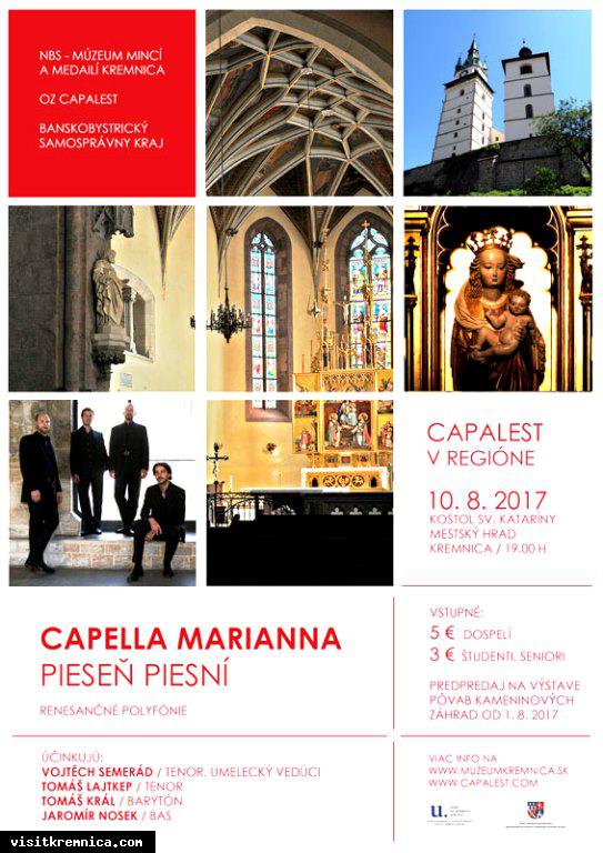 Už po 11-ty raz sa otvárajú brány festivalu Cap à l’Est v regióne, ktorý v roku 2017 prináša naozajstnú lahôdku pre milovníkov renesančného umenia. Počas koncertného turné po banskobystrickom kraji sa predstaví české komorné hudobné teleso Cappella Mariana s vokálnou sekciou. Štyria vokalisti, dvaja tenori, bas a barytón, neopakovateľným spôsobom podajú starovekú Pieseň piesní v prevedení renesančných európskych skladateľov.