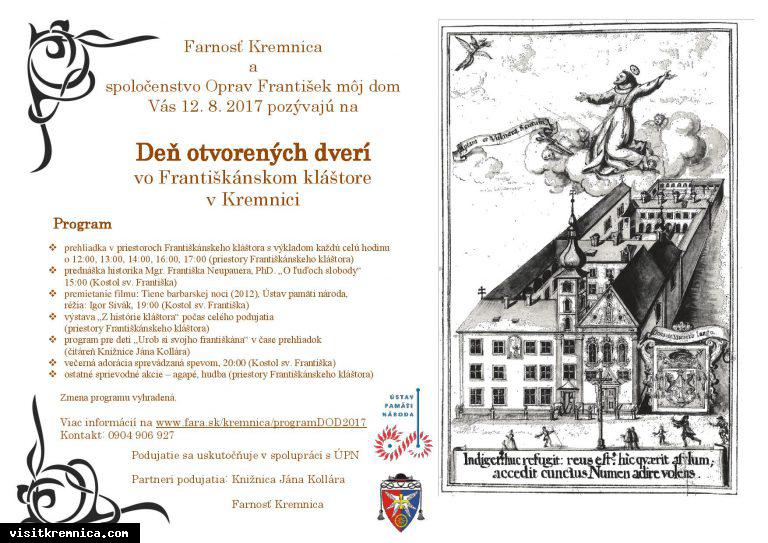 Čo: Deň otvorených dverí vo Františkánskom kláštore Kedy: 12. august 2017, 12:00 Kde: Františkánsky kláštor, Štefánikovo námestie Kremnica