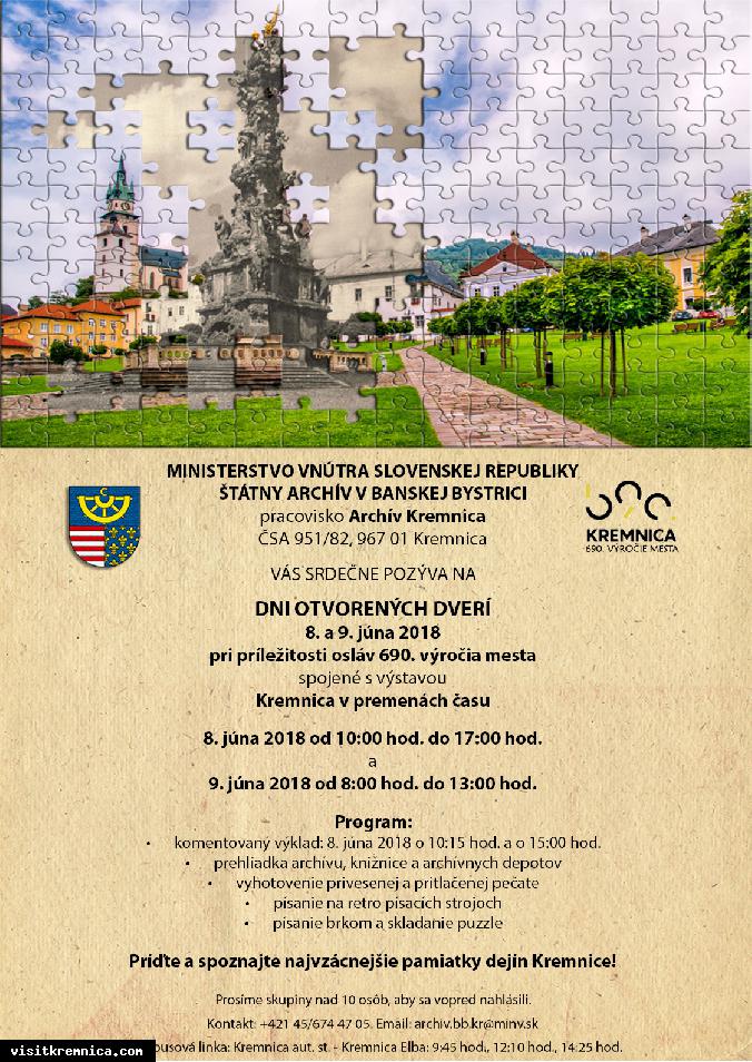 MV SR, Štátny archív v Babnskej Bystrici, pracovisko Kremnica Vás srdečne pozýva na Dni otvorených dverí pri príležitosti osláv 690. Výročia mesta, spojené s výstavou Kremnica v premenách času.