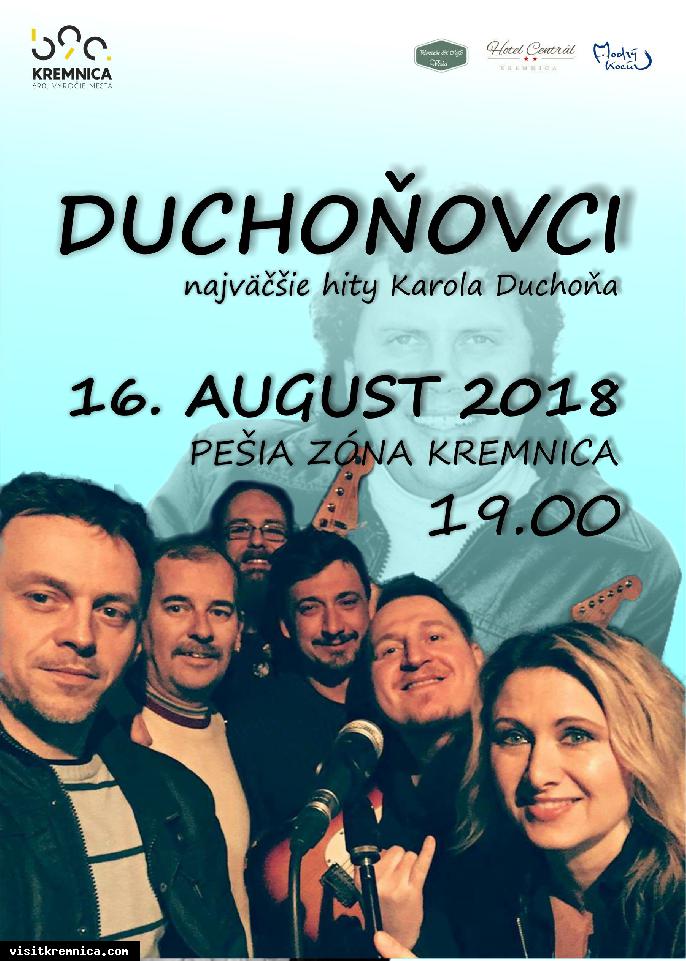 Ďalší z letných koncertov na pešej zóne v Kremnici prináša nestarnúce hity Karola Duchoňa v podaní skvelých banskobystrických muzikantov združených v zoskupení Duchoňovci.