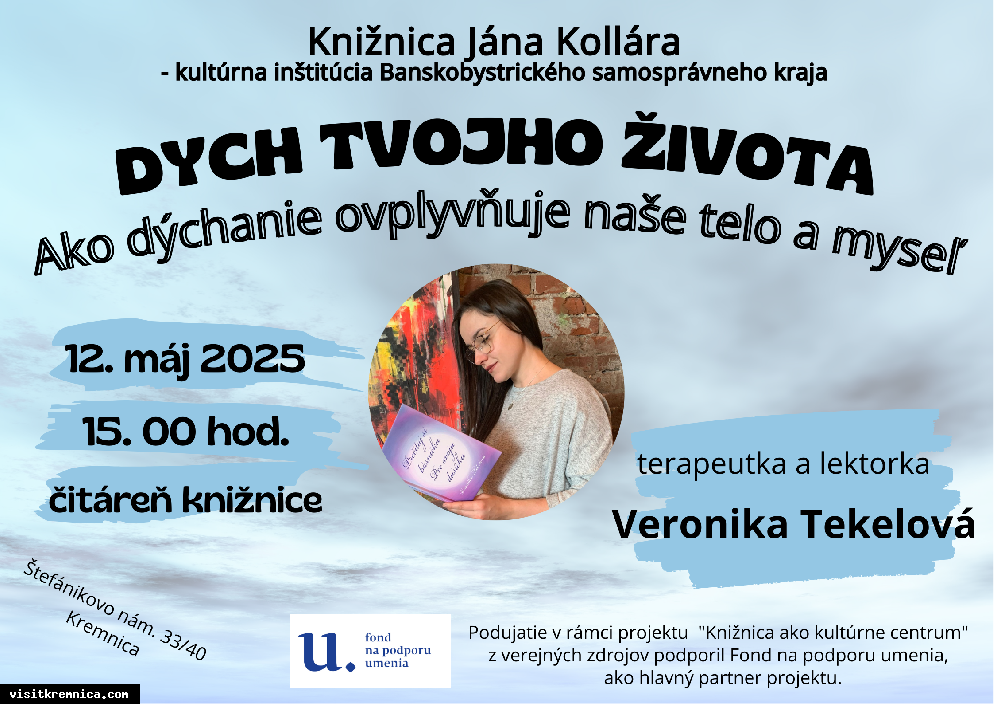 Knižnica Jána Kollára Vás srdečne pozýva na prednášku terapeutky a lektorky Veroniky Tekelovej, kde sa naučíte praktické dychové techniky na upokojenie, načerpanie energie a zvládanie stresu.