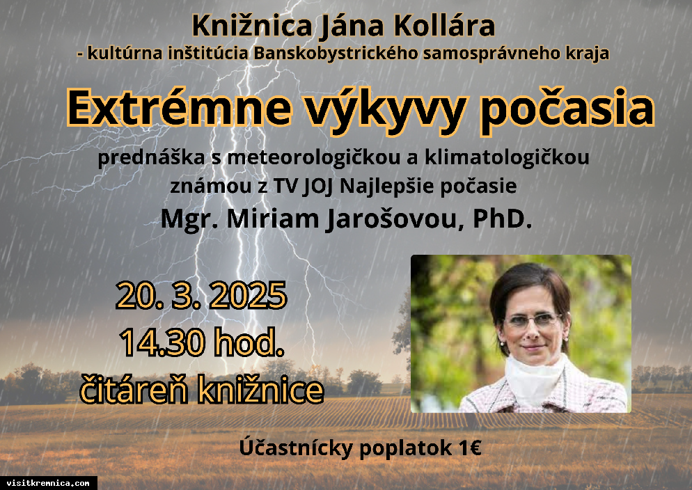 Knižnica Jána Kollára Vás pozýva na odbornú prednášku meteorologičky a klimatologičky Miriam Jarošovej, známej z TV JOJ Najlepšie počasie. Venovať sa bude najmä vplyvom vzdialených situácií na počasie v Európe, z ktorých sa môžu na našom území vytvoriť extrémne výkyvy počasia. Podujatie sa uskutoční vo štvrtok 20.3.2025 o 14.30 hod. v čitárni knižnice.