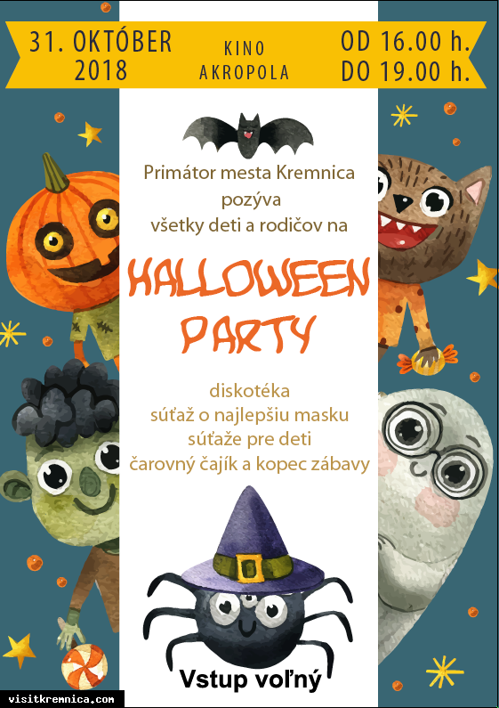 Primátor mesta Kremnica pozýva všetky deti a rodičov na Halloween Party do Akropoly. V rámci programu bude diskotéka, súťaž pre najlepšiu masku, súťaže pre deti, čarovný čajík a kopec zábavy.