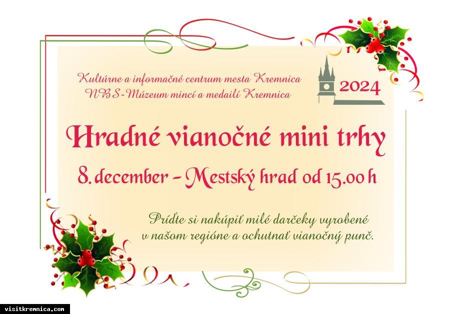 Kultúrne a informačné stredisko mesta Kremnica a NBS Múzeum mincí a medailí pozývajú na Hradné vianočné mini trhy 8. decembra 2024 od 15.00. Príďte si vybrať z milých darčekov regionálnych remeselníkov a výrobcov a ochutnať vianočný punč.