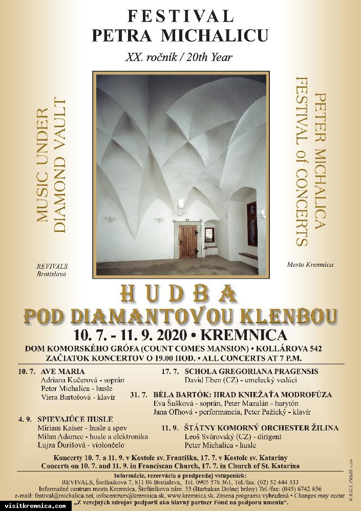 Koncert v rámci 20. ročníka tradičného festivalu majstra Petra Michalicu, Hudba pod diamantovou klenbou. Účinkujú: Eva Šušková - soprán, Peter Mazalán - barytón, Jana Oľhová - performancia, Peter Pažický - klavír