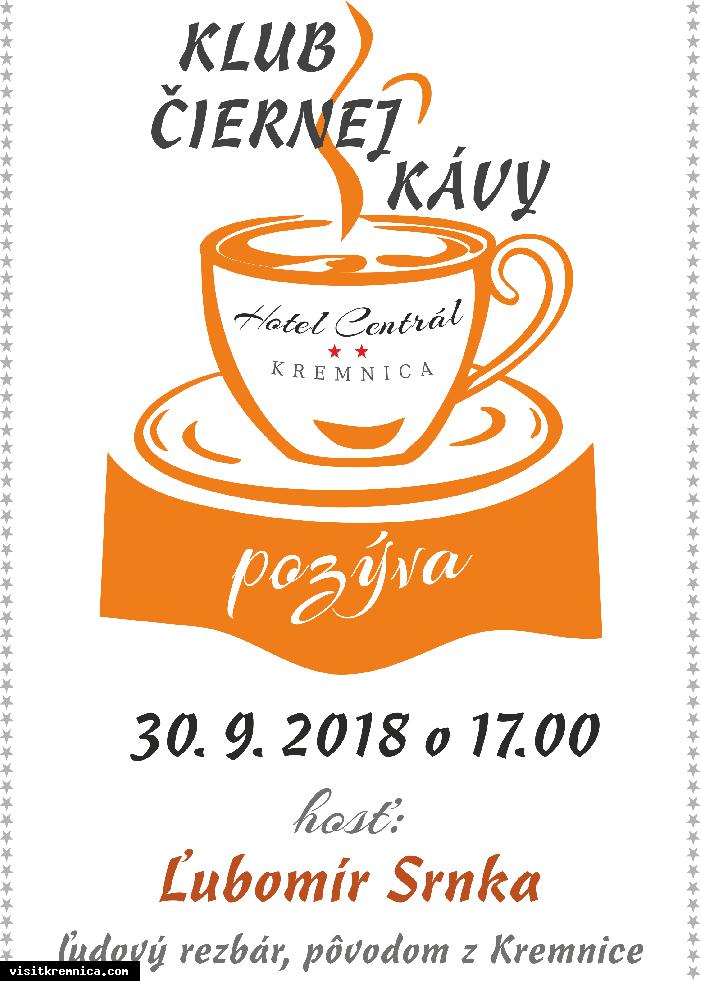 Čo: Klub čiernej kávy / Ľubomír Srnka Kedy: 30. september 2018, 17.00 Kde: Hotel Centrál Kremnica Hotel Centrál a Klub Čiernej kávy pozývajú na besedu a stretnutie s ľudovým rezbárom pochádzajúcim z Kremnice, Ľubomírom Srnkom.