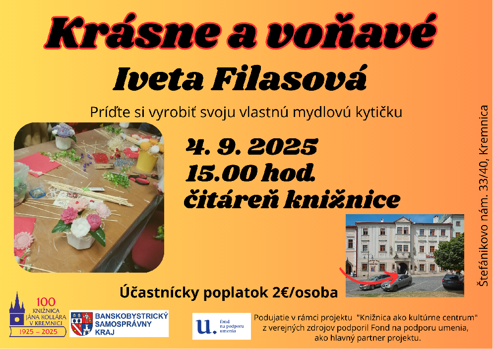 Príďte si vytvoriť krásnu a voňavú kytičku z mydla pri ďalšom kreatívnom workshope pod vedením Ivety Filasovej. Dozviete sa ako sa mydlo vyrába, farbí a vonia a vyrobíte si krásnu dekoráciu, ktorá poteší oči a prevonia Váš domov. Účastnícky poplatok je 2€ na osobu.