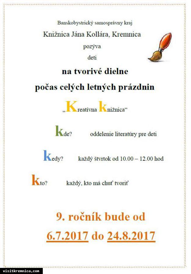 Čo: Kreatívny knižnica – tvorivé dielne počas letných prázdnin Kedy: 06. júl 2017, 10:00 (každý prázdninový štvrtok) Kde: Knižnica J.Kollára, Kremnica