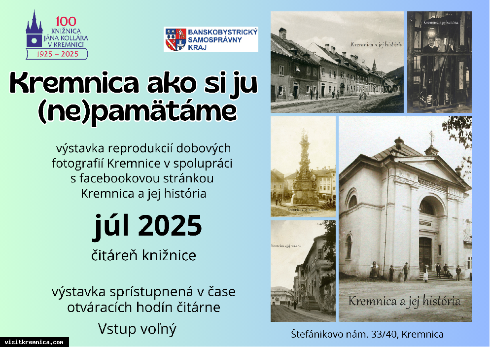 Počas mesiaca júl bude v čitárni Knižnice Jána Kollára, v čase otváracích hodín, prístupná výstavka reprodukcií dobových fotografií Kremnice pod názvom "Kremnica ako si ju (ne)pamätáme". Výstavka vznikla v spolupráci s facebookovou stránkou Kremnica a jej história. Srdečne Vás pozývame. Vstup je voľný.