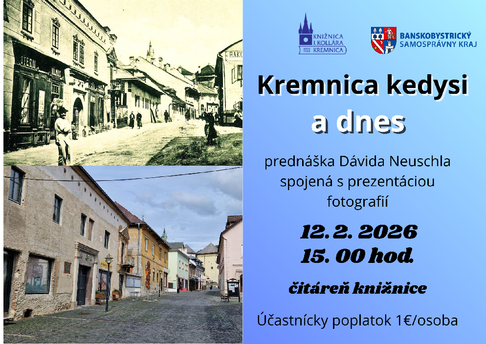 Pozývame Vás na prednášku Dávida Neuschla pod názvom Kremnica kedysi a dnes, ktorá nadväzuje na rovnomennú výstavku. Na tomto podujatí sa dozviete ako konkrétne miesta v Kremnici vyzerali kedysi a ako vyzerajú dnes, ako aj historické zaujímavosti. Účastnícky poplatok 1€/osoba.