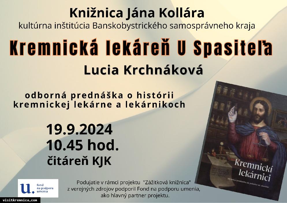 Pozývame Vás na odbornú prednášku o histórii kremnickej lekárne a lekárnikoch. Prednášateľkou bude Lucia Krchnáková, ktorá na túto tému predstaví svoju knihu pod názvom Kremnickí lekárnici. Vstup je voľný.