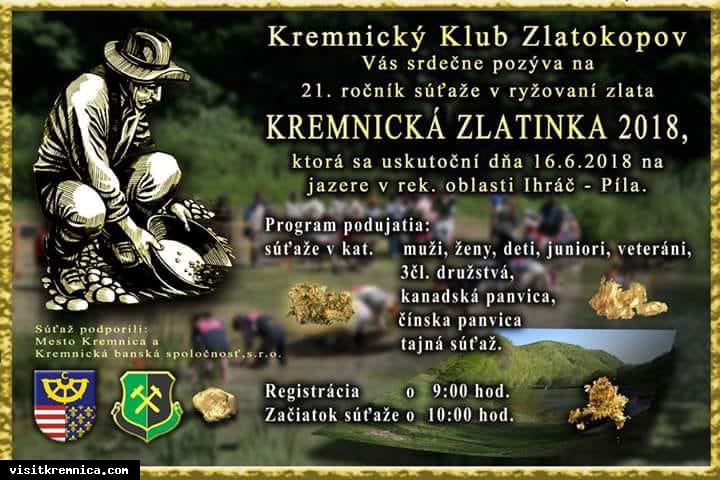Čo: Kremnická zlatinka 2018 Kedy: 16. jún 2018, 09.00 Kde: Ihráč – Píla Kremnický klub zlatokopov organizuje 21. ročník súťaže v ryžovaní zlata.