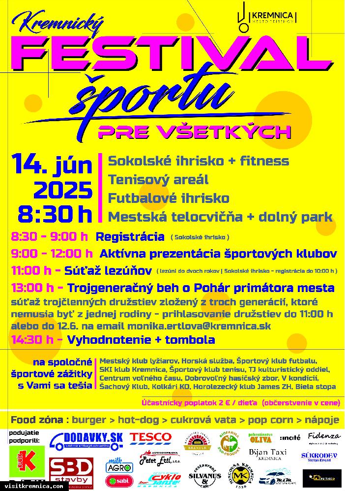 Mesto Kremnica, športové kluby pôsobiace v Kremnici a všetci partneri vás srdečne pozývajú na Festival športu pre všetkých, ktorý sa uskutoční na Sokolskom ihrisku, tenisových kurtoch, futbalovom ihrisku, v mestskej telocvični a v dolnom parku.