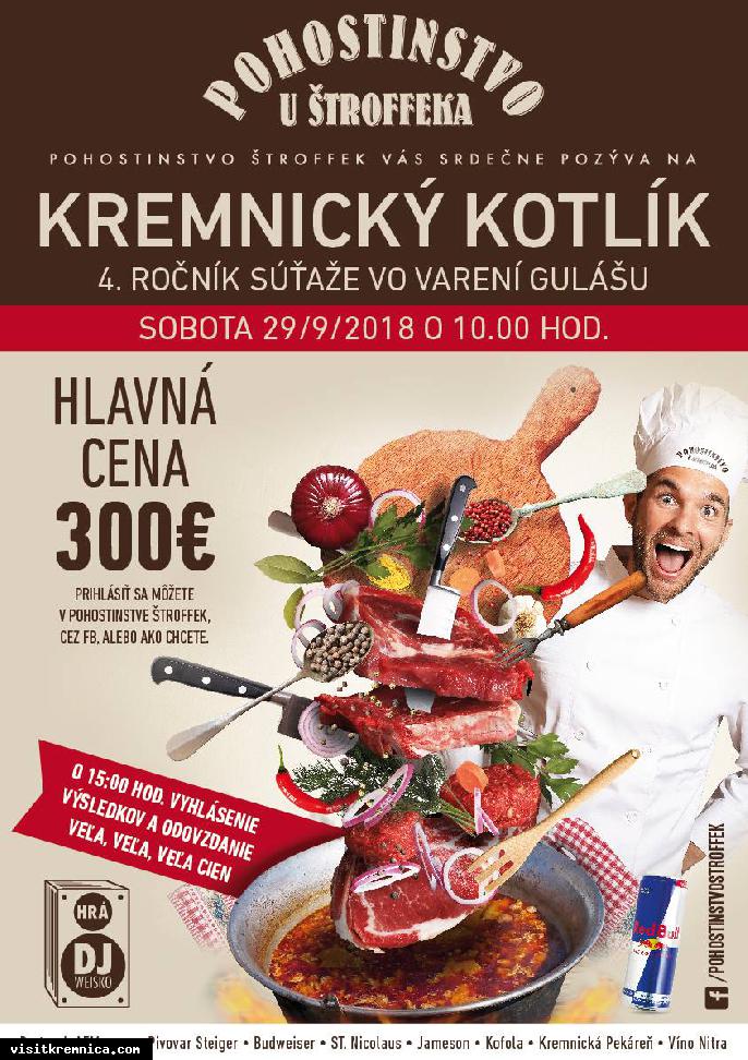 Čo: Kremnický kotlík 2018 Kedy: 29. september 2018, 10.00 Kde: Pohostinstvo Štroffek 4. ročník súťaže vo varení gulášu. Hlavná cena 300 €. Prihlásiť sa je možné priamo v Pohostinstve Štroffek, alebo cez Facebook Pohostinstva Štroffek.
