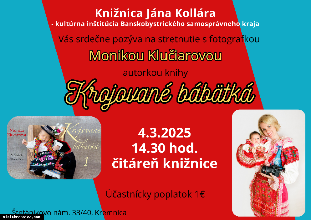 V rámci Týždňa slovenských knižníc Vás pozývame na stretnutie s umeleckou fotografkou Monikou Klučiarovou, autorkou knihy \"Krojované bábätká\". Autorka spája neopísateľné čaro novorodencov so vzácnou prácou našich predkov a tak netradičným spôsobom povyšuje krásu krojových tradícií. Podujatie bude spojené s výstavou umeleckých fotografií bábätiek v krojoch, autorka zahrá na fujare a bližšie predstaví projekt \"Krojované bábätká\". Účastnícky poplatok je 1€.