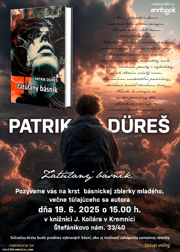 Srdečne všetkých pozývame na krst básnickej zbierky Zatúlaný básnik - mladého, večne túlajúceho sa Kremničana, Patrika Düreša. Súčasťou krstu bude prednes vybraných básní a možnosť zakúpenia samotnej zbierky s podpisom autora. Vstup voľný.