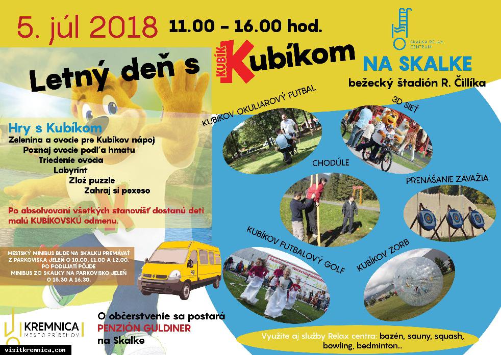 Mesto Kremnica Vás pozýva na už tradičné podujatie Letný deň s Kubíkom, počas ktorého sa budú môcť vyblázniť malí aj veľkí. Minibus Vás na Skalku prepraví o 10.00, 11.00, 12.00 a zo Skalky do Kremnice o 15.30 a 16.30.