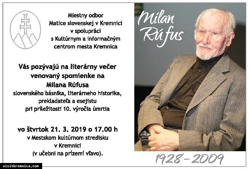 Čo: Literárny večer - Milan Rúfus Kedy: 21. marec 2019, 17.00 Kde: MsKS Kremnica Miestny odbor matice slovenskej v Kremnici a Kultúrne a informačné centrum mesta Kremnica Vás pozývajú na literárny večer venovaný spomienke na Milana Rúfusa.
