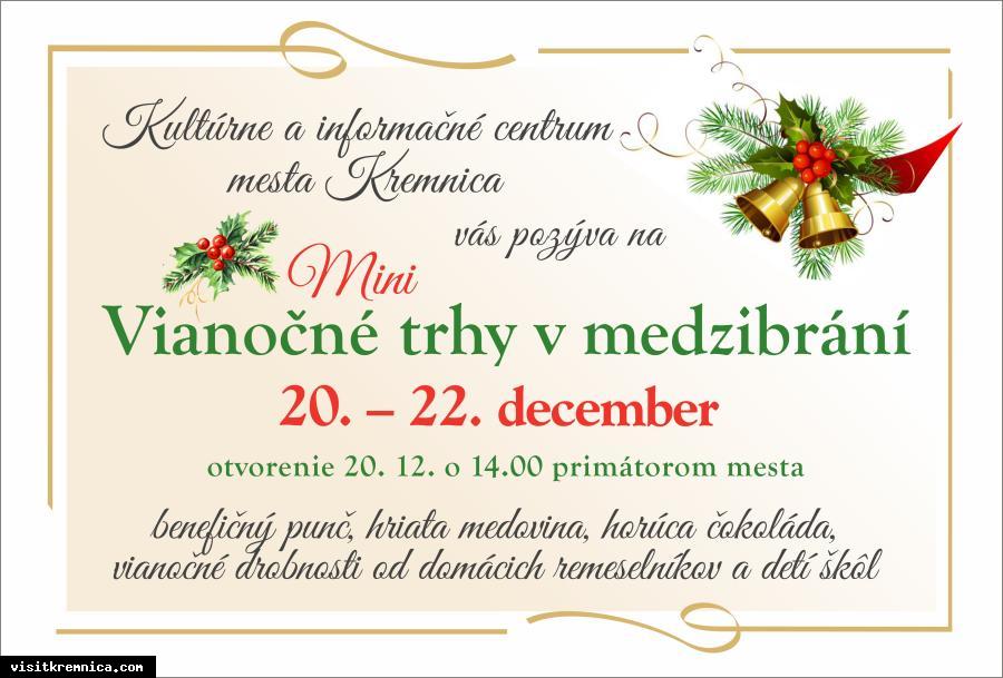 Kultúrne a informačné centrum mesta Kremnica pozýva na Mini Vianočné trhy v medzibrání, ktoré sa uskutočnia v termíne od 20. - 22. decembra 2023.