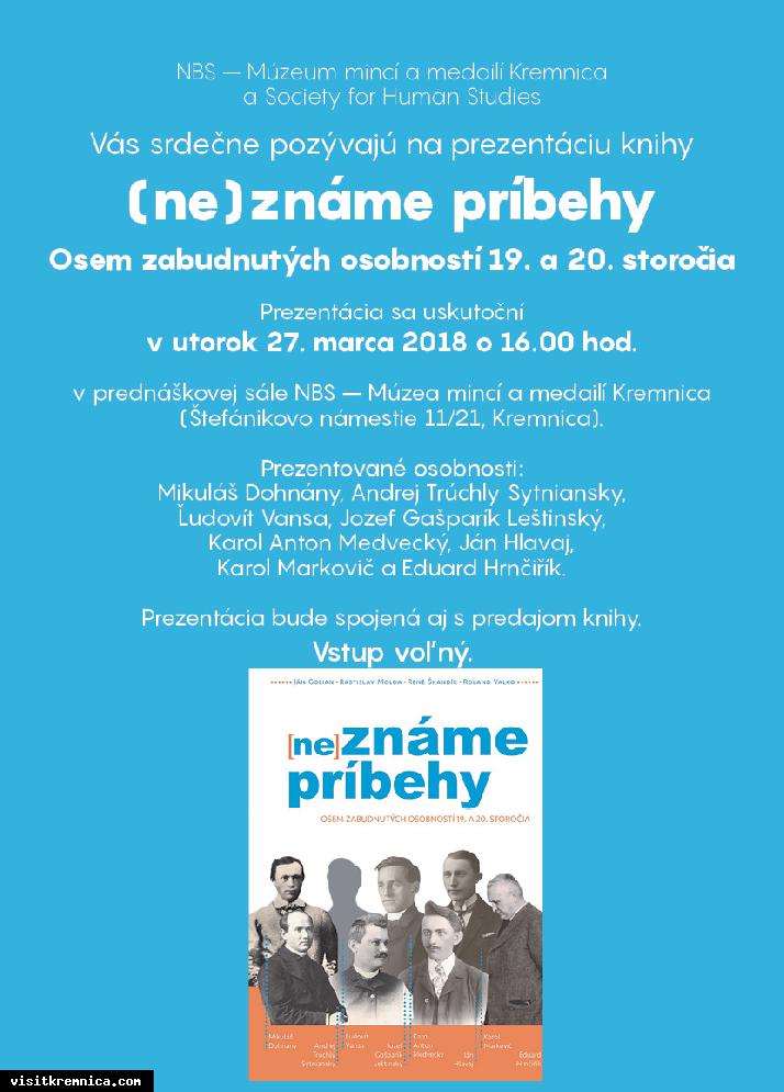 Čo: (ne)známe príbehy Kedy: 27. marec 2018, 16.00 Kde: prednášková sála NBS – Múzea mincí a medailí Kremnica NBS – MMM Kremnica a Society for Human Studies Váýs pozývajú na prezentáciu knihy (ne)známe príbehy, Osem zabudnutých osobností 19. a 20. storočia.