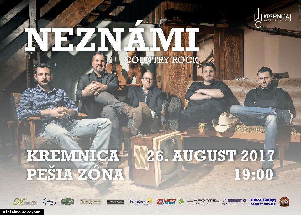 Čo: Neznámi Kedy: 26. august 2017, 19:00 Kde: pešia zóna Kremnica Koncert úspešnej slovenskej country rockovej skupiny