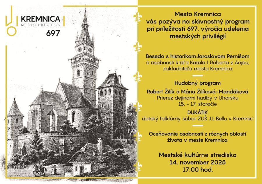 14. novembra 2025 o 17.00 vás pozývame do Mestského kultúrneho strediska na slávnostný program pri príležitosti udelenia mestských privilégií. Súčasťou bohatého programu bude beseda s historikom o osobnosti kráľa Karola Róberta z Anjou, v hudobnom programe sa zoznámite s dejinami hudby v Uhorsku v 15. – 17. storočí a vystúpi detský folklórny súbor Dukátik, ktorý pôsobí pri ZUŠ J. L. Bellu.
