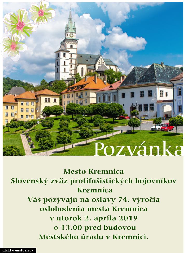 Čo: Oslavy 74. výročia oslobodenia mesta Kedy: 02. apríl 2019, 13.00 Kde: Štefánikovo námestie (pred MsÚ) Mesto Kremnica a Slovenský zväz protifašistických bojovníkov Kremnica Vás pozývajú na oslavy 74. výročia oslobodenia mesta Kremnica.