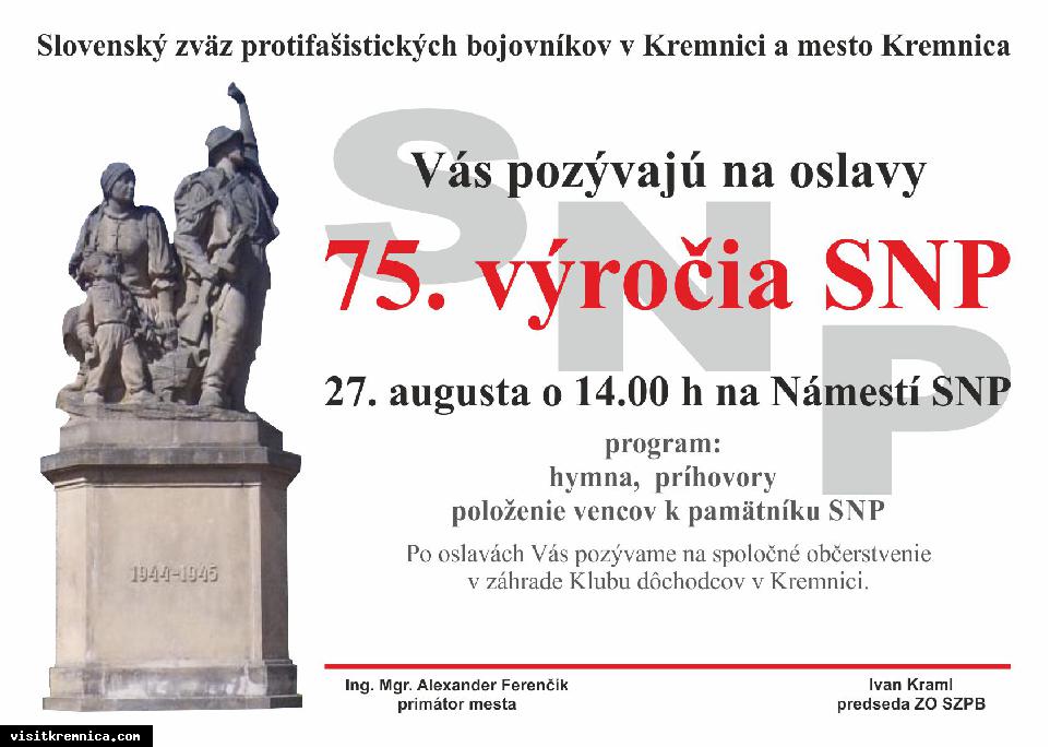 Čo: Oslavy 75. výročia SNP Kedy: 27. august 2019, 14.00 Kde: Námestie SNP Kremnica