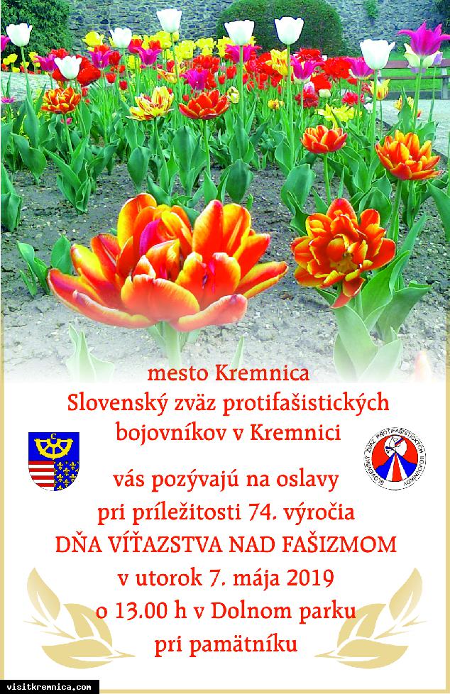 Čo: Oslavy Dňa víťazstva nad fašizmom Kedy: 07. máj 2019, 13.00 Kde: Dolný park Mesto Kremnica a Slovenský zväz protifašistických bojovníkov v Kremnici Vás pozývajú na oslavy pri príležitosti 74. výročia Dňa víťazstva nad fašizmom