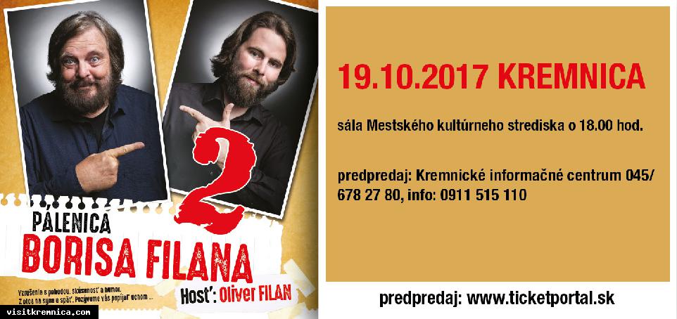 Legendárna Pálenica Borisa Filana prichádza do Kremnice aj s hosťom Oliverom Filanom. Vzrušenie s pohodou, skúsenosť a humor. Z otca na syna a späť. Pozývame Vás popíjať uchom ... Predpredaj vstupeniek v cene 10 € v Kremnickom a informačnom centre mesta Kremnica (045/6782780).
