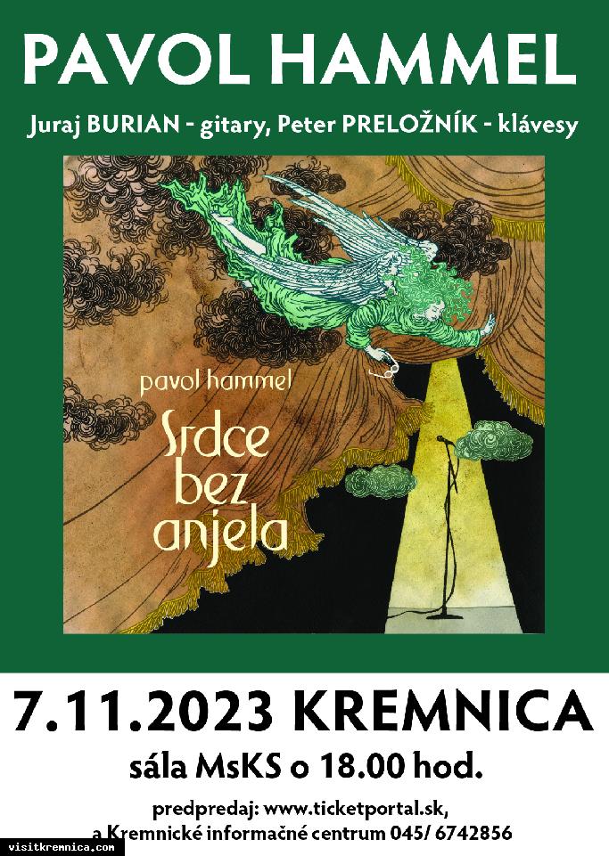 Pozývame vás na koncert legendárneho speváka a hudobníka Pavla Hammela "Srdce bez anjela". Spoluúčinkujú Juraj Burian - gitary a Peter Preložník - klávesy.