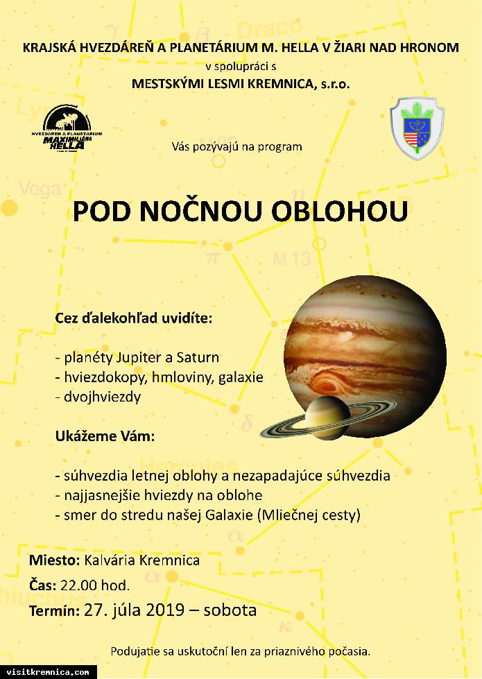 Krajská hvezdáreň a planetárium M. Hella v Žiari nad Hronom v spolupráci s Mestskými lesmi Kremnica, s.r.o. Vás pozývajú na nočné pozorovanie oblohy. Cez ďalekohľad uvidíte planéty Jupiter a Saturn, hviezdokopy, hmloviny galaxie ...