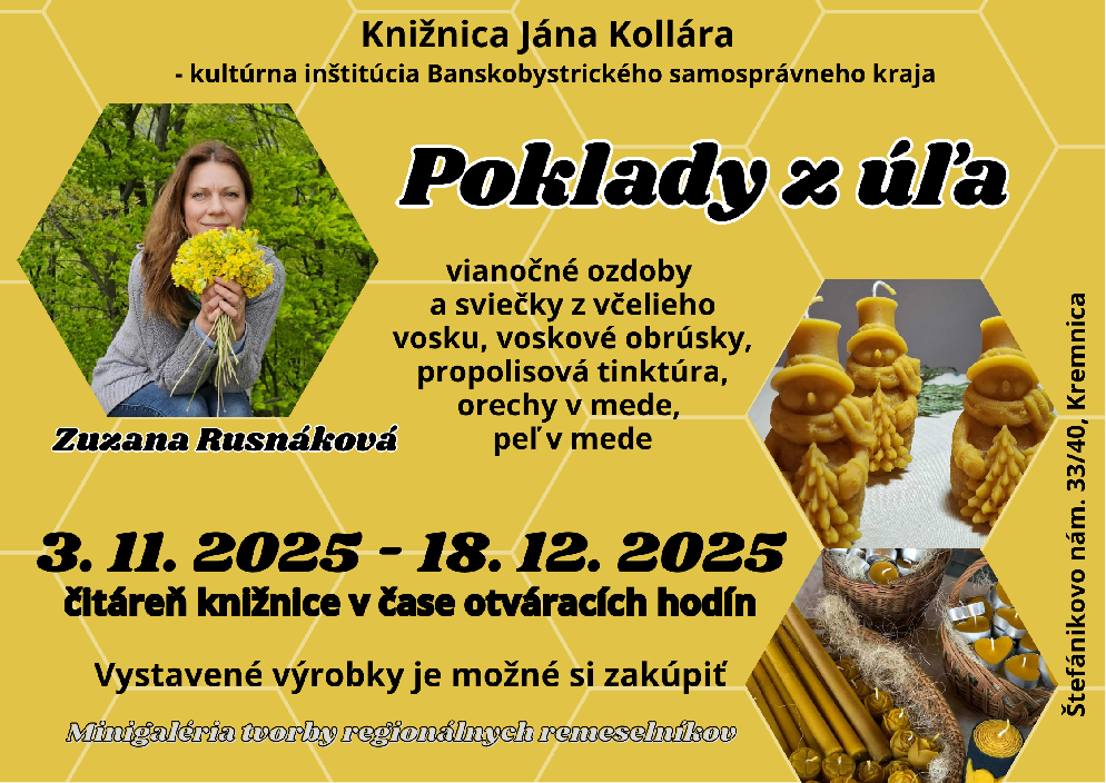 V rámci minigalérie tvorby regionálnych remeselníkov sme pripravili pre všetkých milovníkov včeličiek výstavku Zuzany Rusnákovej z Nevoľného pod názvom Poklady z úľa. Predstaví svoje výrobky z včelieho vosku a ďalšie včelie produkty ako napr. vianočné ozdoby a sviečky z včelieho vosku, voskové obrúsky, propolisovú tinktúru, peľ v mede, orechy v mede a ďalšie výrobky. Všetky tieto výrobky je možné si zakúpiť v čitárni knižnice.