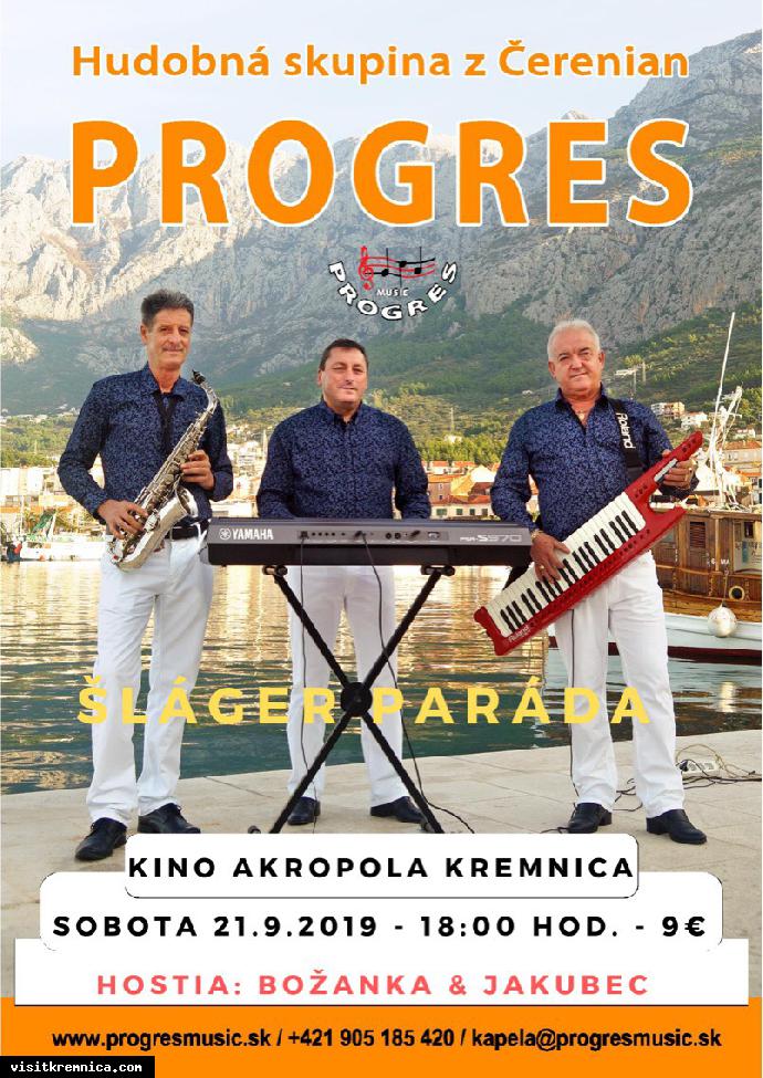 Čo: Progres - hudobná skupina z Čerenian Kedy: 21. september 2019, 18.00 Kde: Akropola Kremnica Skupina známa zo Šláger TV si so sebou do Kremnice privezie prominentných hostí Božanku a Martina Jakubca. Vstupné: 9 €