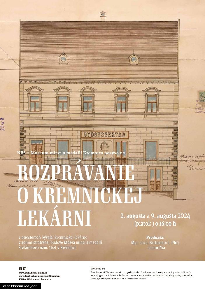 NBS – Múzeum mincí a medailí Kremnica pozýva na zaujímavú prednášku s názvom Rozprávanie o kremnickej lekárni, ktorá sa uskutoční v priestoroch bývalej kremnickej lekárne, v súčasnej administratívnej budove Múzea mincí a medailí na Štefánikovom námestí v Kremnici.