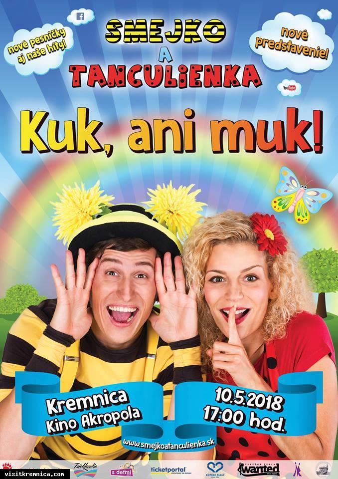 Úplne nové predstavenie s najobľúbenejšími chrobáčikmi Smejkom a Tanculienkou! Dokonca príde aj ich kamarát motýlik Huncúlika spoločne zahrajú nové hity z tretieho DVD Kuk, ani muk! Nebudú chýbať pesničky ako Motáčik Popletáčik, Sestričky farbičky, Tri prasiatka, Škaredé káčatko, Usmej sa, Ahoj, ahoj… ale zaspievajú aj toľko žiadaného Boxeristu, Vajce na vandrovke a Babu Jagu!