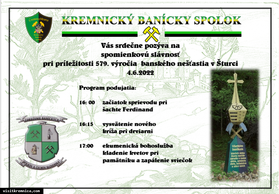 Kremnický banský spolok Vás pozýva na slávnostnú spomienku pri príležitosti 579. výročia banského nešťastia v Šturci, ktorá sa uskutoční 4.6.2022