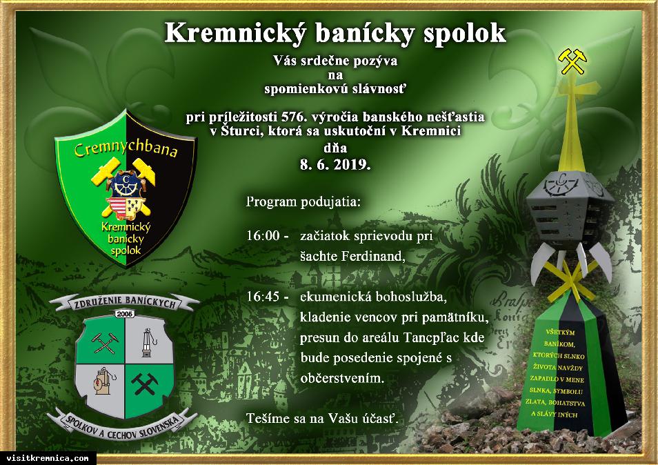 Čo: Spomienková slávnosť Šturec 2019 Kedy: 08. jún 2019, 16.00 Kde: Šachta Ferdinand Kremnický banícky spolok Vás pozýva na spomienkovú slávnosť pri príležitosti 576. výročia banského nešťastia v Šturci.