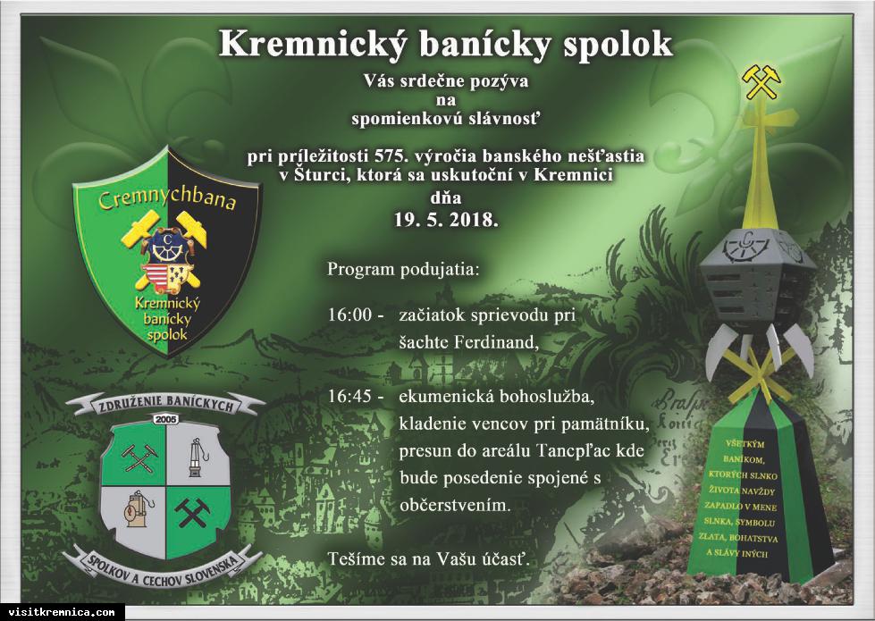Čo: Spomienková slávnosť Šturec Kedy: 19. máj 2018, 16.00 Kde: šachta Ferdinand, prepadlisko Šturec, tancpľac na Ľudovíke Kremnický banícky spolok Vás srdečne pozýva na spomienkovú slávnosť pri príležitosti 575. výročia banského nešťastia v Šturci.