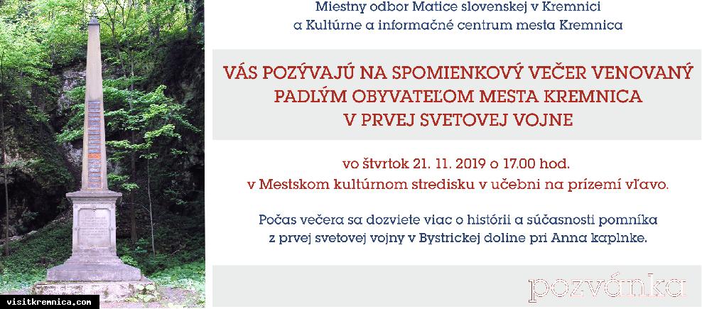 Miestny odbor Matice slovenskej v Kremnici a Kultúrne a informačné centrum mesta Kremnica vás pozývajú na spomienkový večer venovaný padlým obyvateľom mesta Kremnica v 1. svetovej vojne.