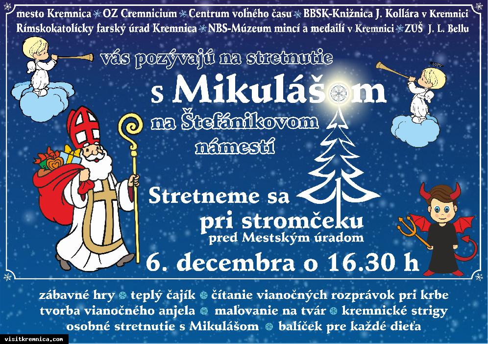 Mesto Kremnica, OZ Cremnicium, CVČ Cvrček, BBSK - Knižnica J. Kollára v Kremnici, Rímskokatolícky farský úrad Kremnica, NBS - Múzeum mincí a medailí v Kremnici a ZUŠ J. L. Bellu Vás pozývajú na stretnutie s Mikulášom. Čakajú na Vás zábavné hry, teplý čaj, čítanie Vianočných rozprávok pri krbe, tvorba Vianočného anjela, maľovanie na tvár, kremnické strigy, balíček pre každé dieťa a samozrejme ... Mikuláš