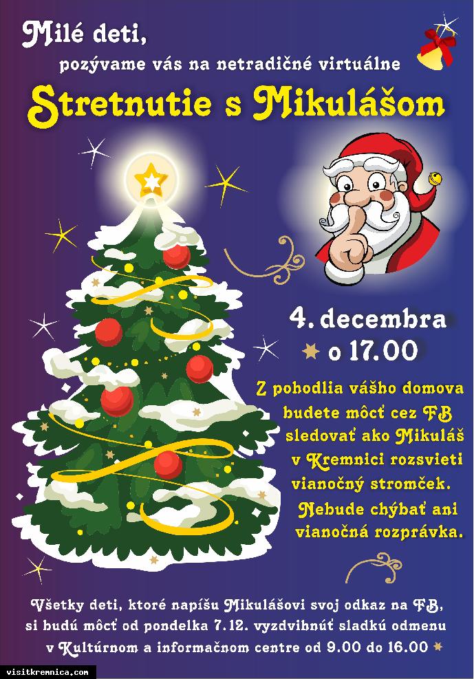 Milé deti, pozývame Vás na netradičné virtuálne Stretnutie s Mikulášom. Z pohodlia vášho domova budete môcť cez Facebook Mesta Kremnica sledovať ako Mikuláš v Kremnici rozsvieti Vianočný stromček a nebude chýbať ani Vianočná rozprávka.