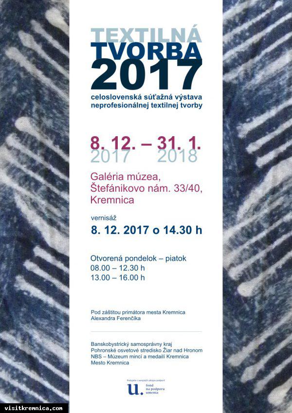 Pohronské osvetové stredisko, Banskobystrický samosprávny kraj, Mesto Kremnica a NBS – Múzeum mincí a medailí Vás pozývajú na vernisáž výstavy Textilná tvorba 2017. Výstava potrvá do 31.01.2018.