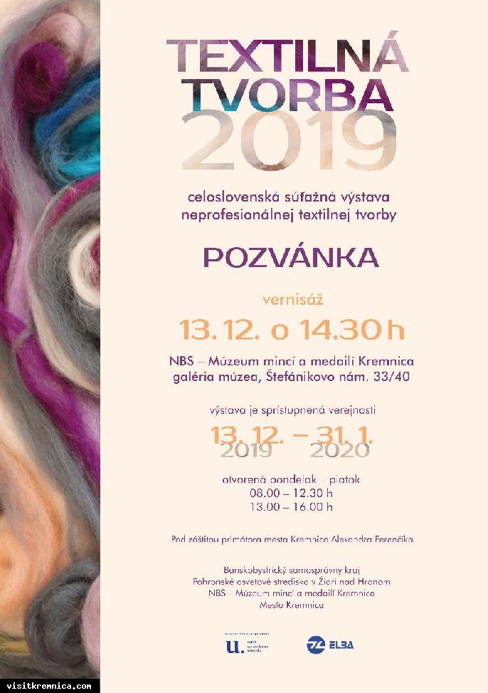 Čo: Textilná tvorba 2019 - vernisáž Kedy: 13. december, 14.30 Kde: NBS - Múzeum mincí a medailí Kremnica, galéria múzea Celoslovenská súťažná výstava neprofesionálnej textilnej tvorby.