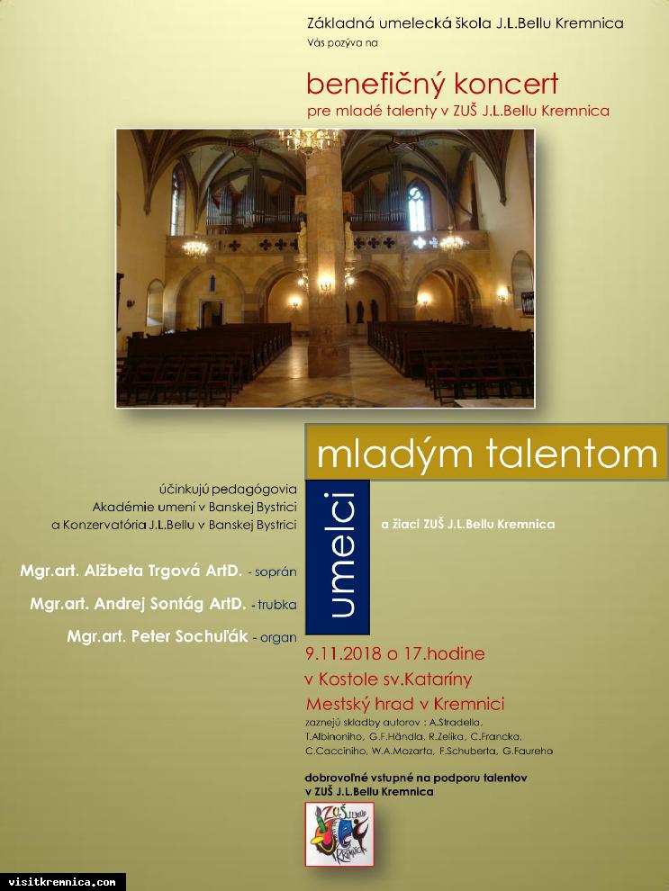 ZUŠ J. L. Bellu v Kremnici Vás pozýva na benefičný koncert pre mladé talenty ZUŠ. Účinkujú pedagógovia Akadémie umení v Banskej Bystrici a Konzervatória J. L. Bellu v Banskej Bystrici Mgr.art. Alžbeta Trgová ArtD. – soprán, Mgr.art. Andrej Sontág ArtD. – trubka, Mgr.art. Peter Sochuľák – organ a žiaci ZUŠ J. L. Bellu v Kremnici. Dobrovoľné vstupné poputuje na podporu talentov v ZUŠ J. L. Bellu v Kremnici.