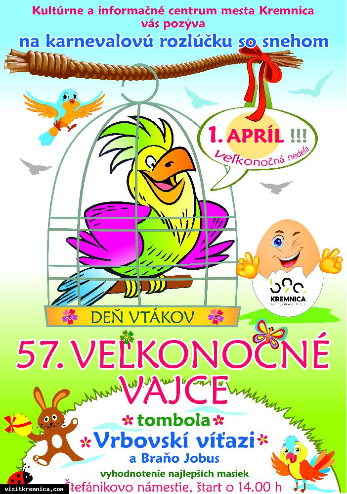Kultúrne a informačné centrum Kremnica Vás srdečne pozýva na 57. Veľkonočné vajce. Okrem tradičnej rozlúčky so snehom a súťaže masiek môžete v tombole vyhrať (nielen) úsmevné ceny a zažiť koncert legendárnych Vrbovských víťazov. Predsedom poroty bude Braňo Jobus. Strávte Deň vtákov úsmevne a veselo.