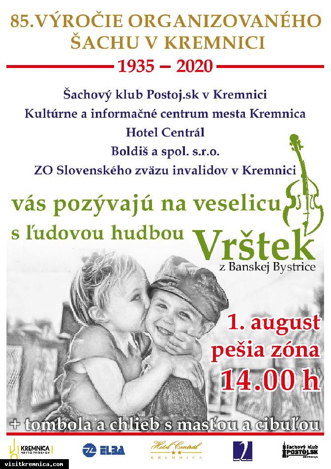 Pri príležitosti 85. výročia organizovaného šachu v Kremnici Vás Šachový klub Postoj.sk v Kremnici, Kultúrne a informačné centrum mesta Kremnica, Hotel Centrál, Boldiš a spol. s.r.o. a ZO Slovenský zväz invalidov v Kremnici, pozývajú na veselicu s ľudovou hudbou Vrštek z Banskej Bystrice. Súčasťou podujatia bude aj tombola a chlieb s masťou a cibuľou.